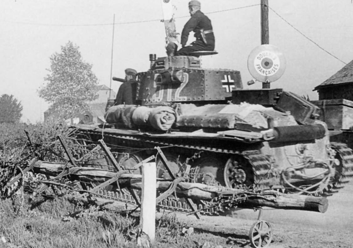 Tysk lätt stridsvagn Panzer 38(t) (ursprungligen en tjeckisk design) under invasionen av Frankrike i juni 1940. Efter att ha ockuperat Tjeckoslovakien införlivade Wehrmacht hundratals sådana tjeckiskt byggda stridsvagnar i sina led, vilket avsevärt förstärkte dess pansarstyrkor.