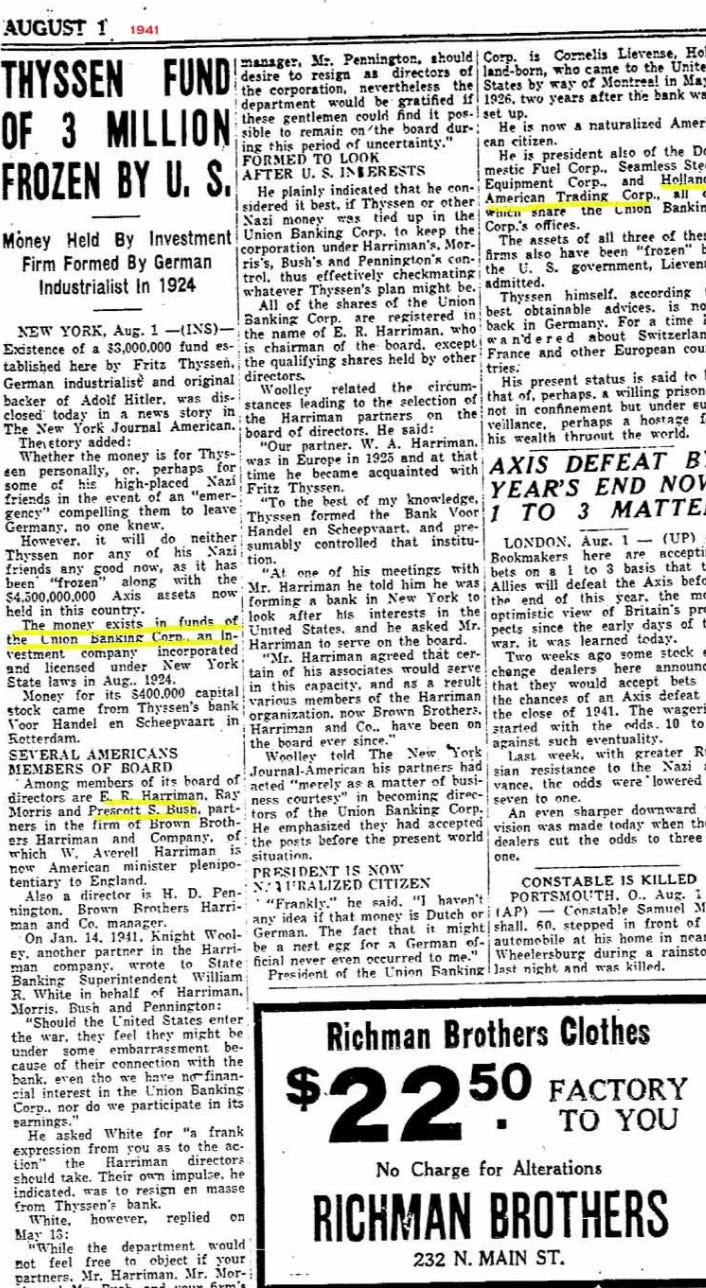 Arkivbevis visar att Union Banking Corporation (UBC), en investeringsfirma i New York nt Bank, som bildades 1924, var starkt knuten till den tyske industrimannen Fritz Thyssen, en av Hitlers tidigaste och mest generösa finansiella stödjare [10]. År 1941 rapporterade New York Journal-American att amerikanska myndigheter hade fryst 3 miljoner dollar som tillhörde Thyssen och som hölls i UBC, som hade ”bildats … för att tillvarata amerikanska intressen” och vars styrelse inkluderade E. R. Harriman, H. D. Pennington och Prescott S. Bush [11].