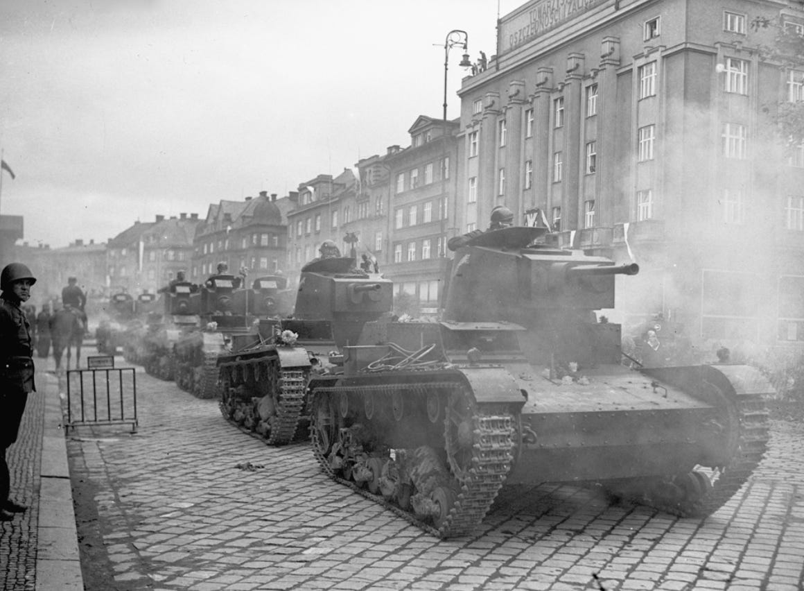 Polska 7TP-stridsvagnar rullar in i den tjeckiska staden Český Těšín (Teschen) i början av oktober 1938. Polen intog den omtvistade Zaolzie-regionen efter Münchenavtalet och utnyttjade Tjeckoslovakiens hjälplösa position.