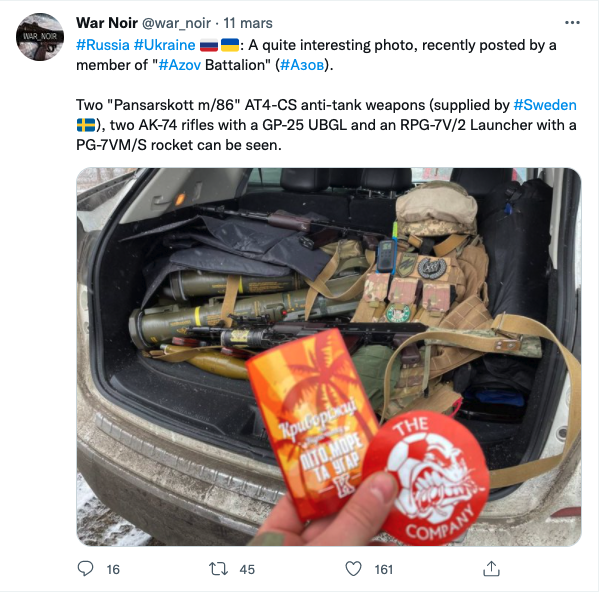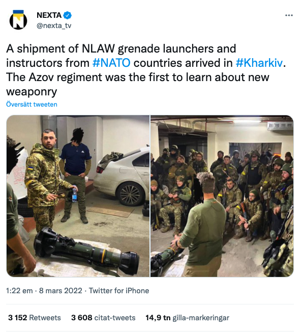 Redan i tisdags förra veckan rapporterade den belarusiska (provästliga) kanalen Nexta att Natovapen, däribland Saab-tillverkade Robot 57, levererats till Azovbataljonen, vilket bland annat Dagens ETC uppmärksammade. Robot 57-systemet är tillverkat av Saab, men inte levererat av Sverige, utan av Storbritannien. Men även svensklevererade vapen tycks ha hamnat i nazisters händer, eller bakluckor.