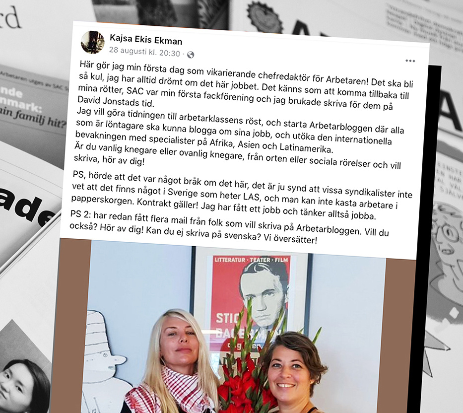 I augusti meddelades att Kajsa Ekis Ekman tillsattes som vice chefredaktör för den syndikalistiska tidningen Arbetaren. Beskedet fick två anställda att säga upp sig i protest och hela Arbetar-styrelsen att avgå.