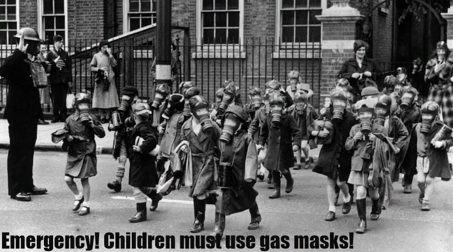 I slutet av september 1938 intensifierades krigspsykosen till kokpunkten med rapporter om att det tyska flygvapnet omedelbart kunde inleda flyganfall mot Paris och London och bomba civilbefolkningen med giftgas. När paniken bröt ut eskalerade den brittiska regeringen den genom att sätta upp stånd där Londons invånare kunde utrustas med gasmasker.