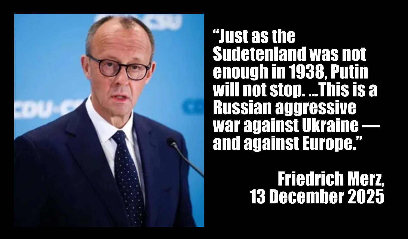 I sitt tal antydde Merz att Rysslands president Vladimir Putin var vår tids Adolf Hitler och varnade sina applåderande partikollegor för att ”Om Ukraina faller, kommer han inte att sluta där.” Han varnade för faran med att blidka denne nye Hitler och antydde att det kunde sluta som undfallenheten mot Nazityskland 1938. Merz påminde sin publik om att ”Precis som Sudetenlandet inte var tillräckligt 1938, kommer Putin inte att sluta. … Detta är ett ryskt aggressivt krig mot Ukraina – och mot Europa.”
