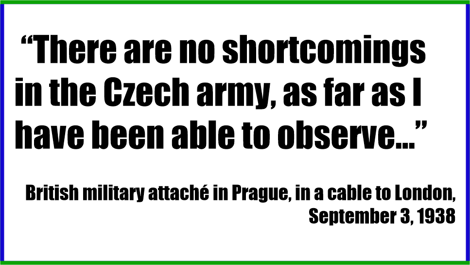 I slutet av 1938 kapitulerade Tjeckoslovakien faktiskt utan motstånd, men detta berodde inte på att dess försvar var svagt. Tjeckoslovakiens regering var snarare förlamad och sövd till följd av den förrädiska planen från Storbritanniens hemliga diplomati.