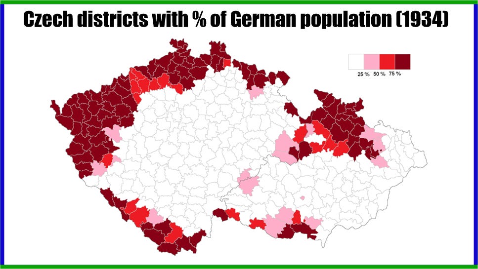 Sudetregionen, belägen längs sin nordvästra gräns mot Tyskland, var den mest industrialiserade delen av landet och hade en majoritet av tysk befolkning. Även om Tjeckoslovakien införde rättvis behandling för alla sina minoriteter, började sudettyskar på 1930-talet pressa på för större politisk makt och autonomi inom Tjeckoslovakien.