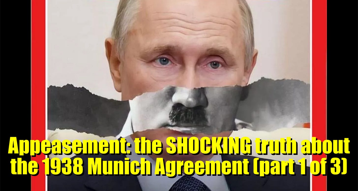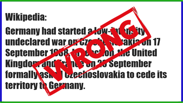 Konventionell historia hävdar att Storbritannien bara blev involverat i denna kris för att förhindra att ett större krig utbröt. Wikipedia-artikeln säger att ”Tyskland hade inlett ett lågintensivt odeklarerat krig mot Tjeckoslovakien den 17 september 1938. Som reaktion bad Storbritannien och Frankrike formellt Tjeckoslovakien att avstå sitt territorium till Tyskland den 20 september…” Det sammanfattar i stort sett historien som den fortfarande lärs ut i skolor överallt.