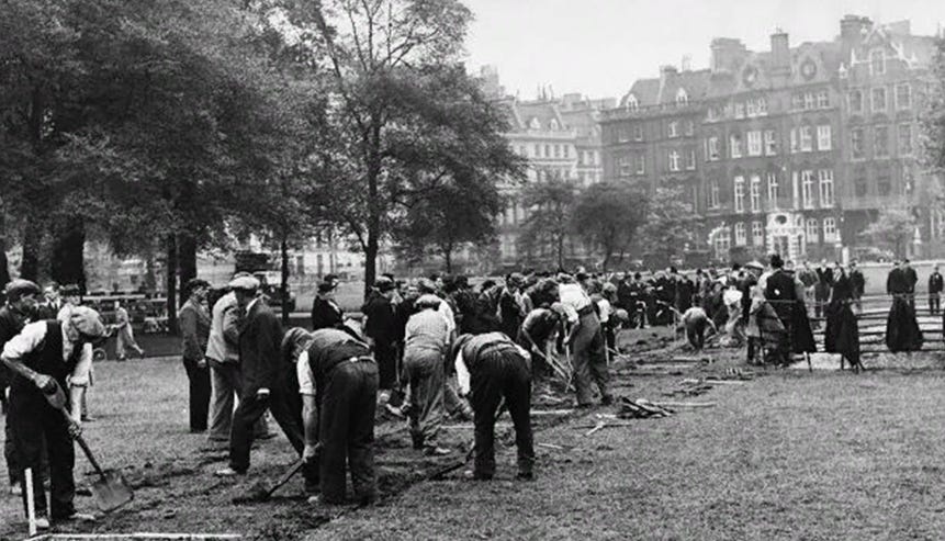 Kung George VI och premiärminister Chamberlain uppmanade britterna att gräva skyttegravar i parker och på torg.