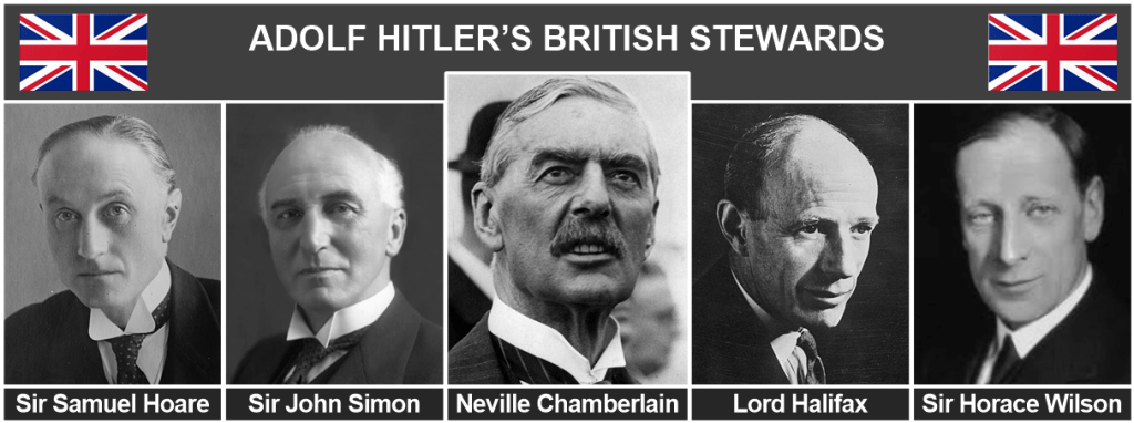 Storbritanniens hemliga utrikespolitik styrdes av en liten grupp män ledda av premiärminister Neville Chamberlain. Den inkluderade Lord Halifax, Sir Horace Wilson, Sir John Simon, Lord Runciman och Sir Samuel Hoare.